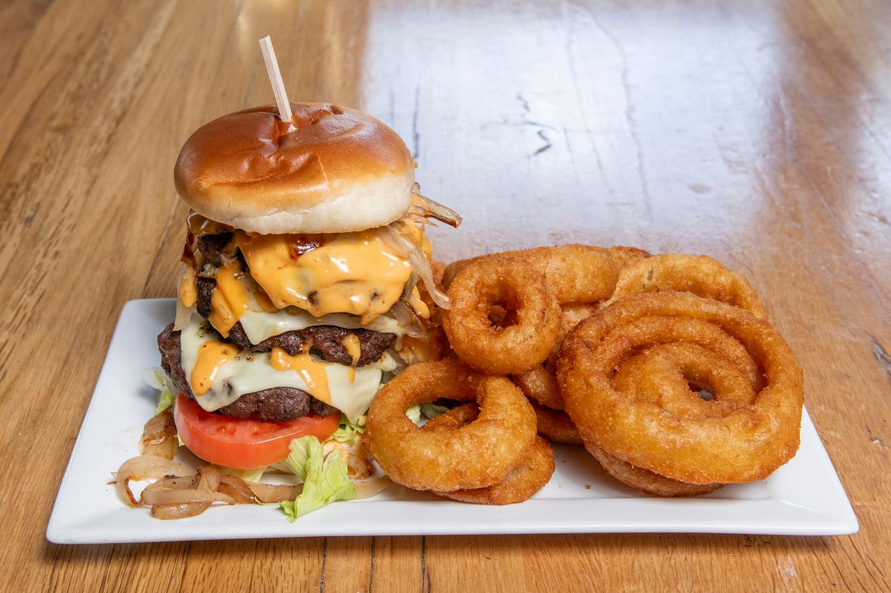 A towering triple cheeseburger stacked with juicy beef patties, melted cheese, grilled onions, fresh toppings, and finished with our signature sauce, served with crispy onion rings.