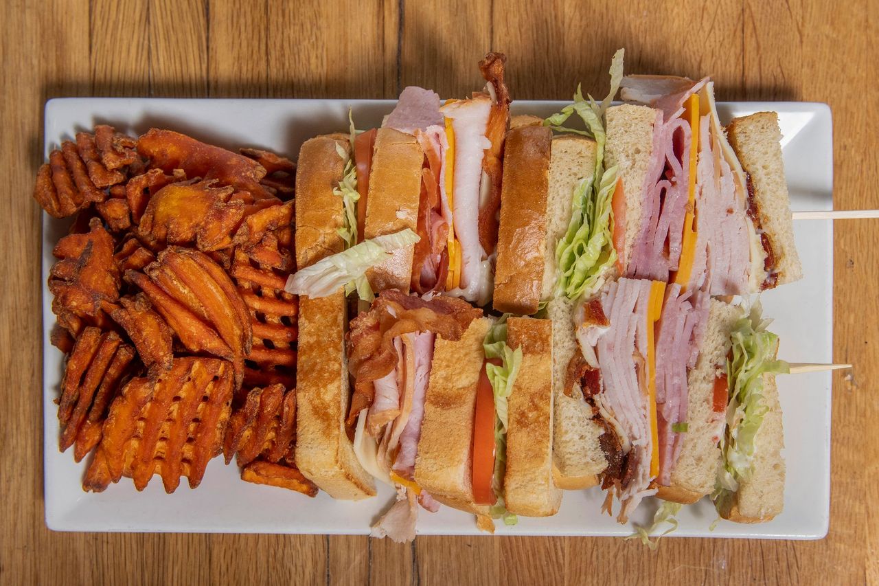 A classic club sandwich stacked with turkey, ham, crispy bacon, melted cheese, lettuce, and tomato, served with a generous side of golden waffle fries.