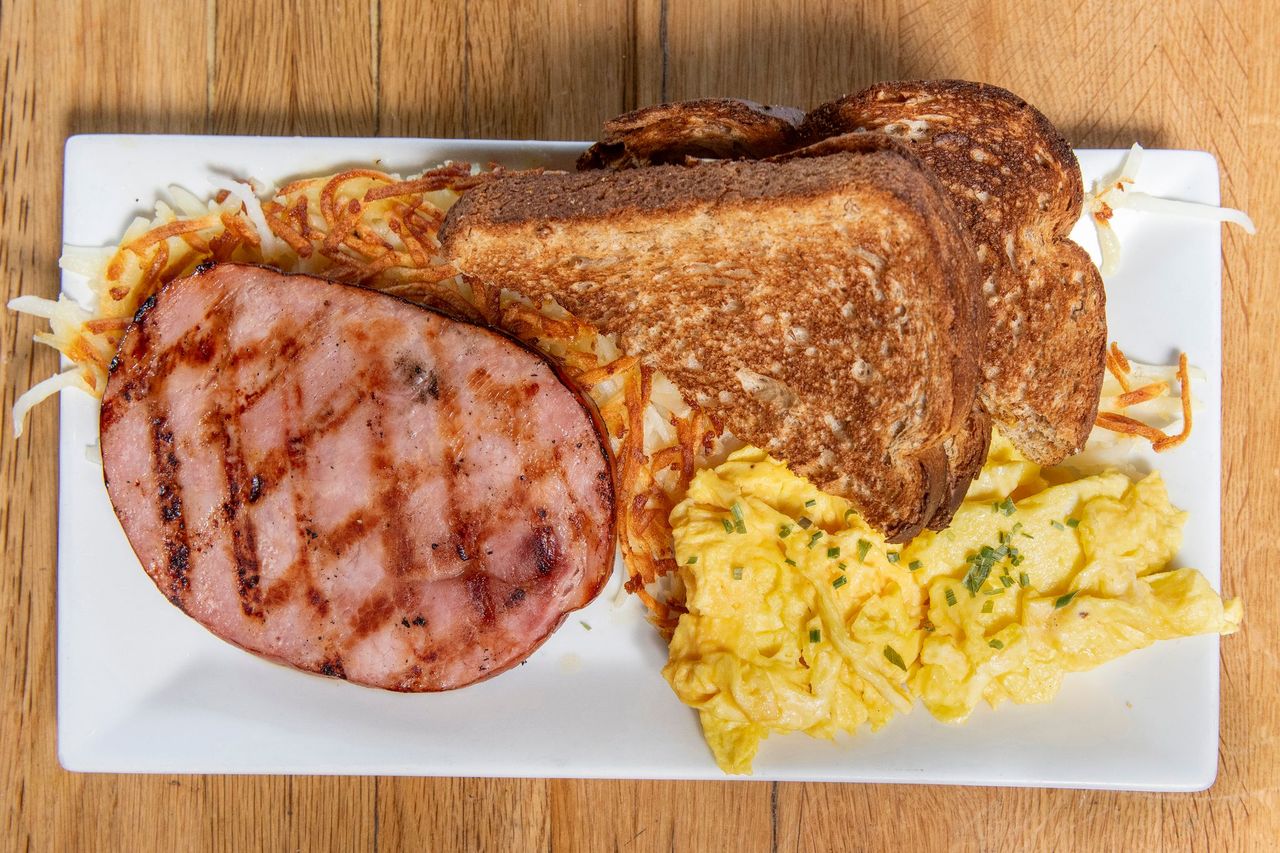 A hearty breakfast plate featuring a grilled ham steak, fluffy scrambled eggs, crispy hash browns, and thick-cut toast.